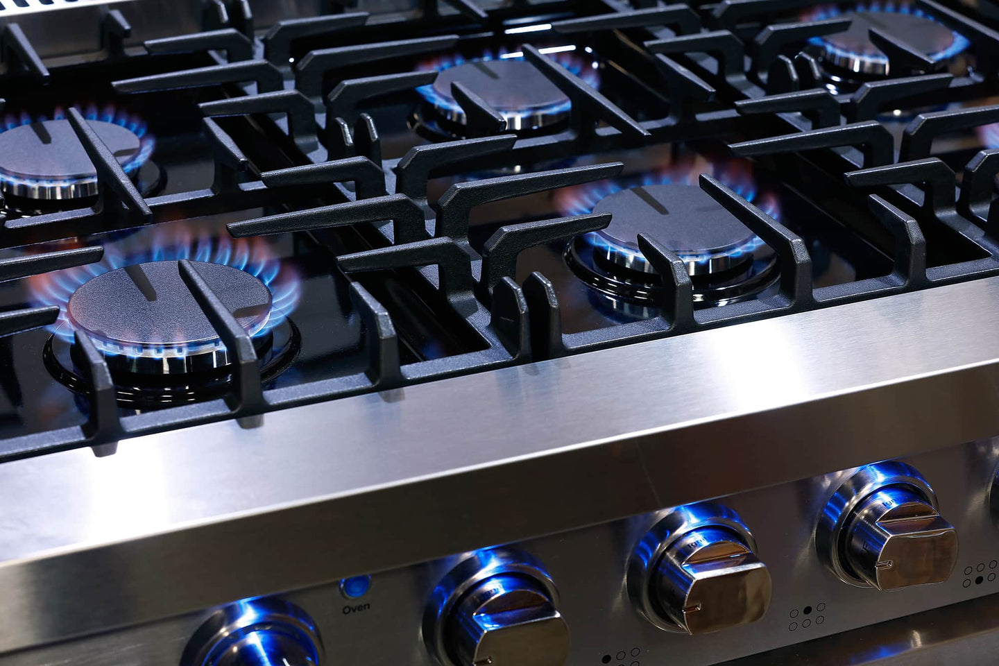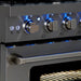 - Bright blue LED indicator lights above oven knobs add a professional touch